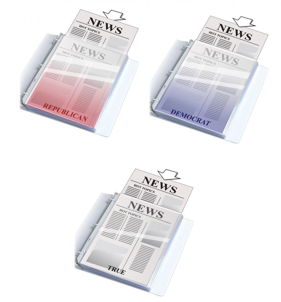- If the news inserted is more biased towards a Republican view, the sheet protector will turn red. On the other hand, if the news is more in a Democrats' voice, the sheet protector will turn blue. If the news is true, then the sheet protector will stay clear.